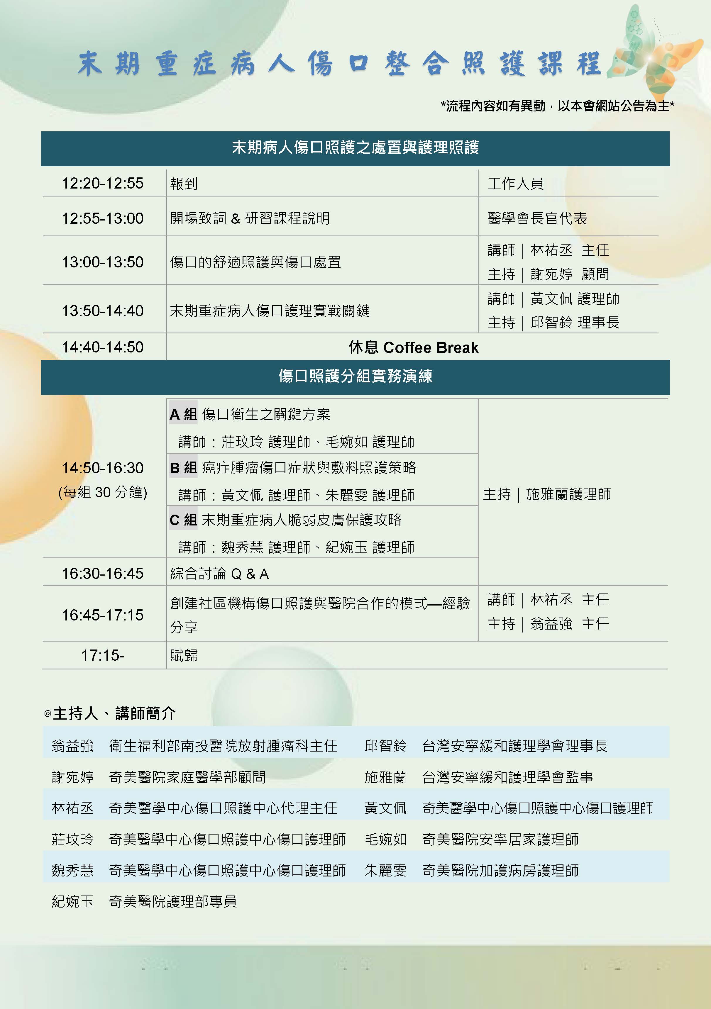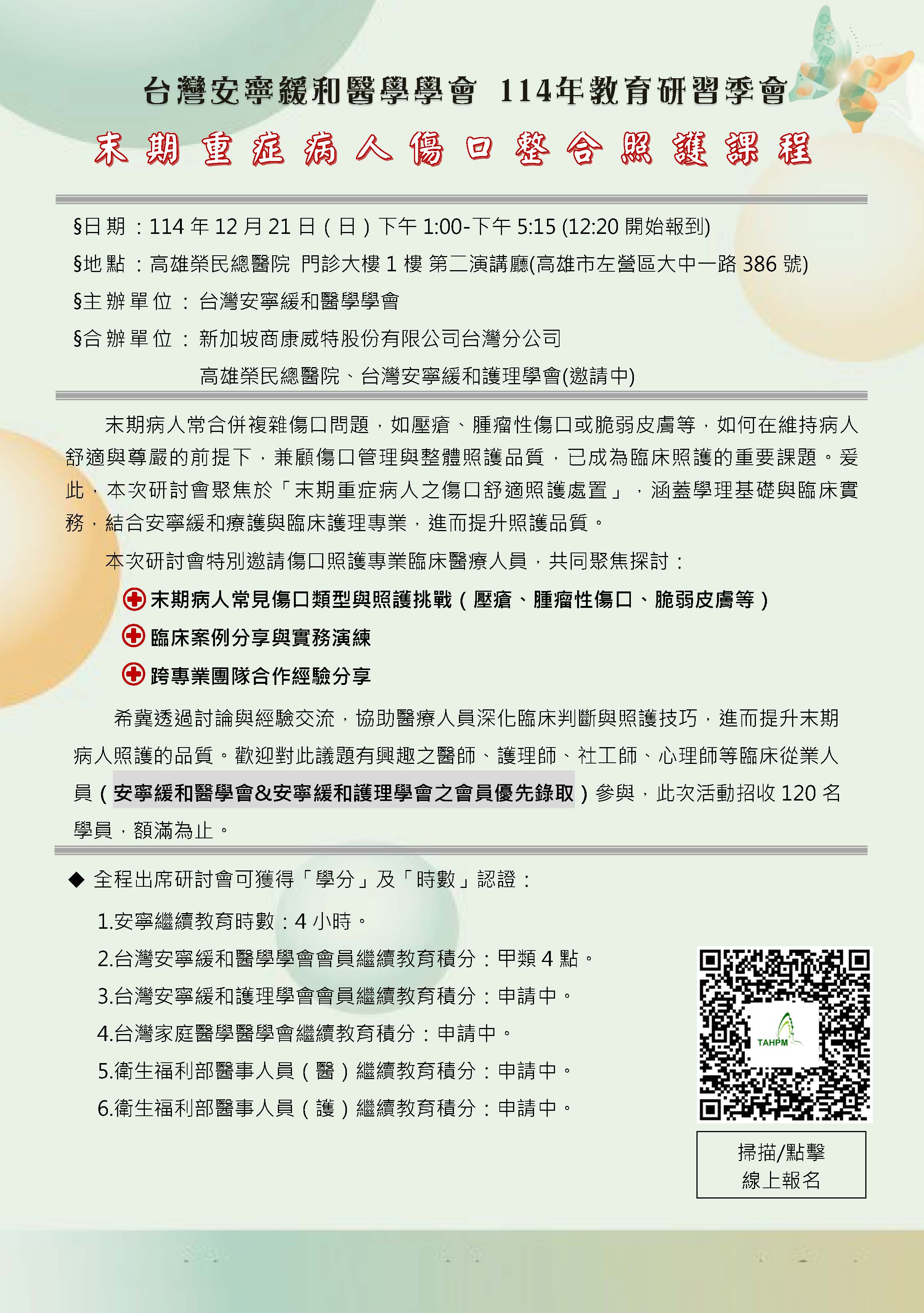 台灣安寧緩和醫學學會 114年教育研習季會 末期重症病人傷口整合照護課程