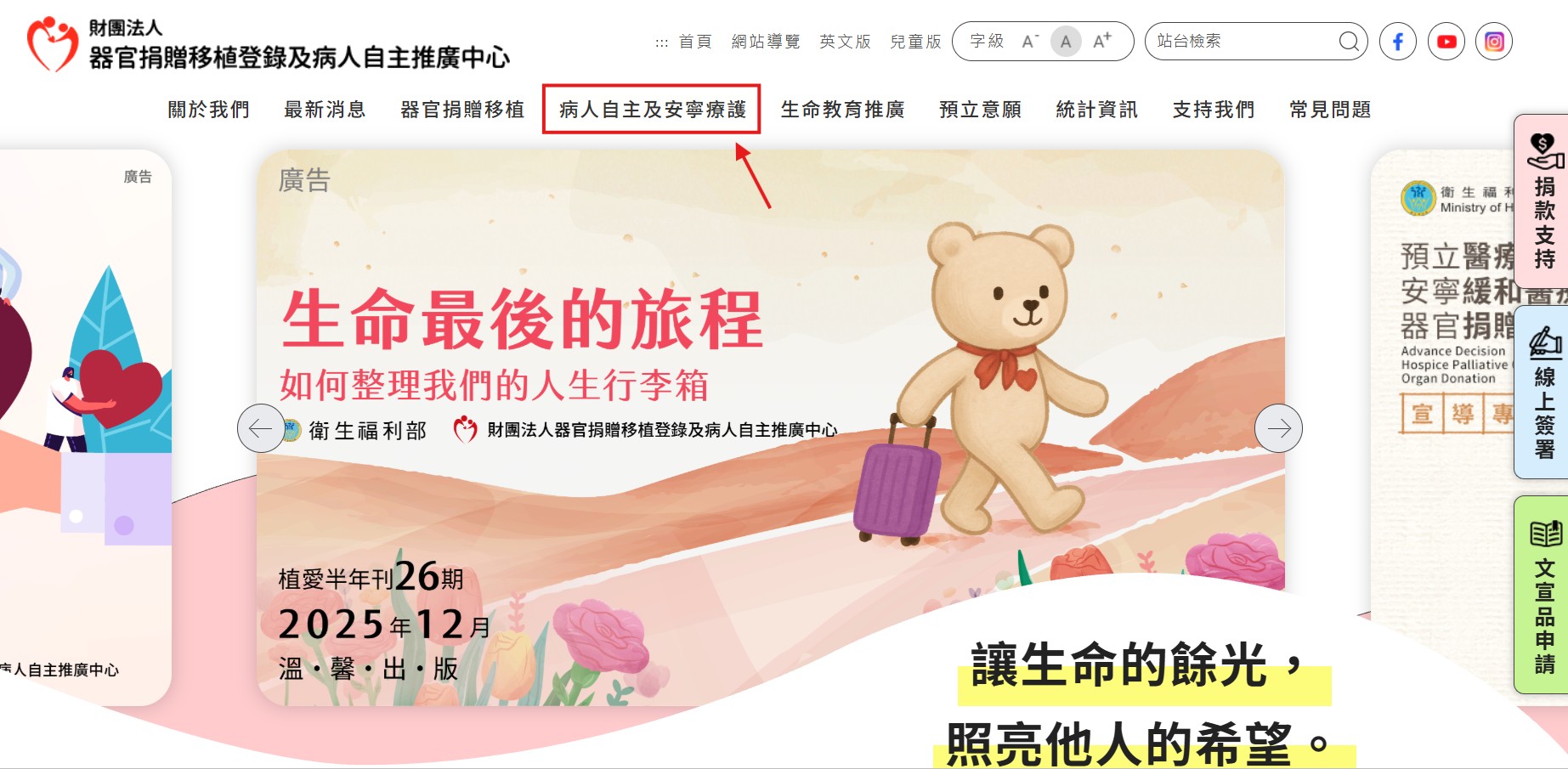 歡迎至 財團法人器官捐贈移植登入及病人自主推廣中心 官網 https://www.tosrpapc.org.tw/