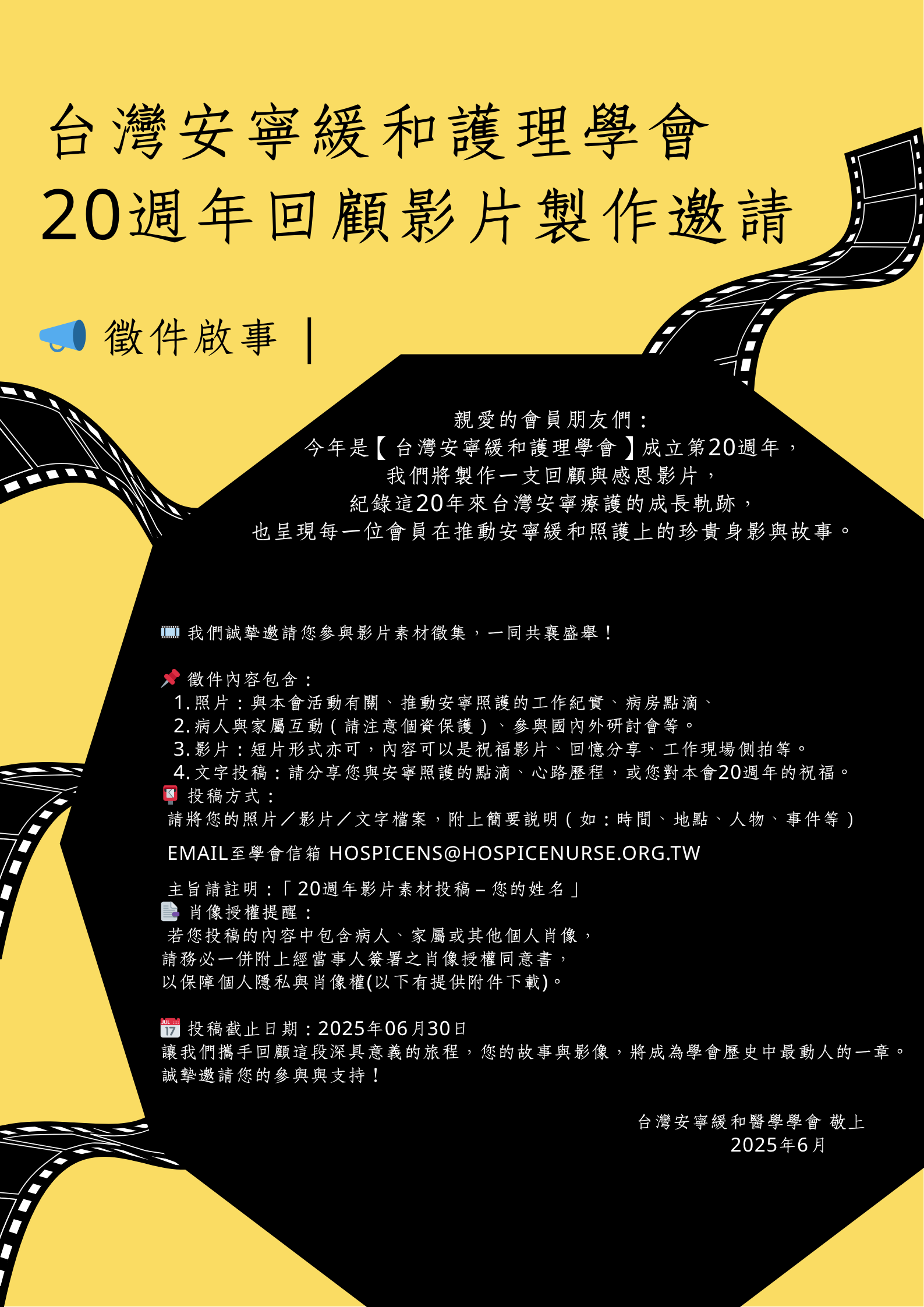 公告 台灣安寧緩和護理學會 20週年回顧影片製作邀請 📣 徵件啟事 |